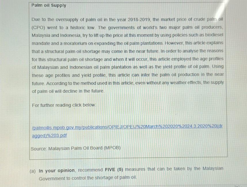 Solved Palm Oil Supply Due To The Oversupply Of Palm Oil In Chegg Com